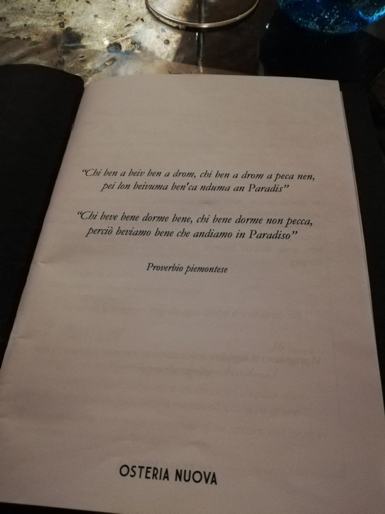 Il locale è davvero incantevole e molto accogliente. Se pensate di andare a pranzo troverete un menù classico della tradizione Piemontese: vitello tonnato, insalata di gallina bionda con indivia, acciughe al verde, tajarin al ragù o con peperoni e acciughe, coniglio, tortino di nocciole. Superlativi gli gnocchi con burro, salvia e granella di nocciole o i fiori di zucca al forno con ricotta. Le proposte cambiano invece la sera, quando è il momento della “merenda sinoira“. Un’idea di pasto che nasce nelle campagne, per dare ristoro ai contadini a fine giornata, dopo aver lavorato nei campi. La merenda sinoira si può definire “l’aperitivo in stile piemontese”, infatti a partire dalle 17,30 è possibile fare degli “assaggi” come ad esempio formaggi (toma, Castelmagno, tomini), acciughe al verde, vitello tonnato, insalata russa, frittate e torte salate, carpione (di pesce, carne o verdure), e verdure in agrodolce (peperoni, cipolle), accompagnati da grissini, pane accompagnati da un bel calice di vino.